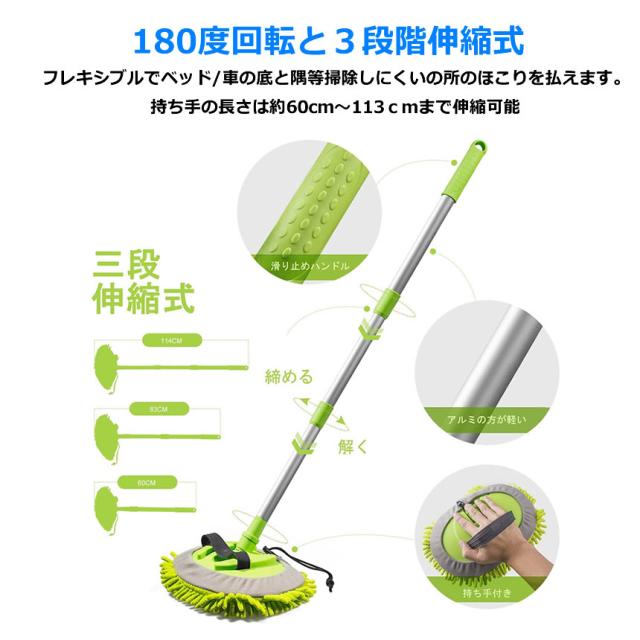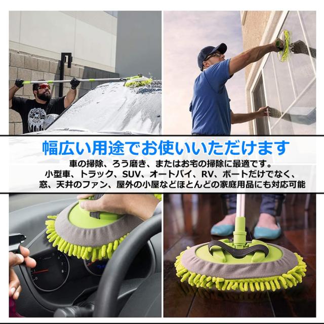 モップヘッドは180°回転可能です、113cmのアルミニウム合金伸縮ロッドが付き、車の屋根、車台等手が届かない場所でも簡単に洗浄でき、小さい車からSUVやトラックのような大きいの車まで適用します