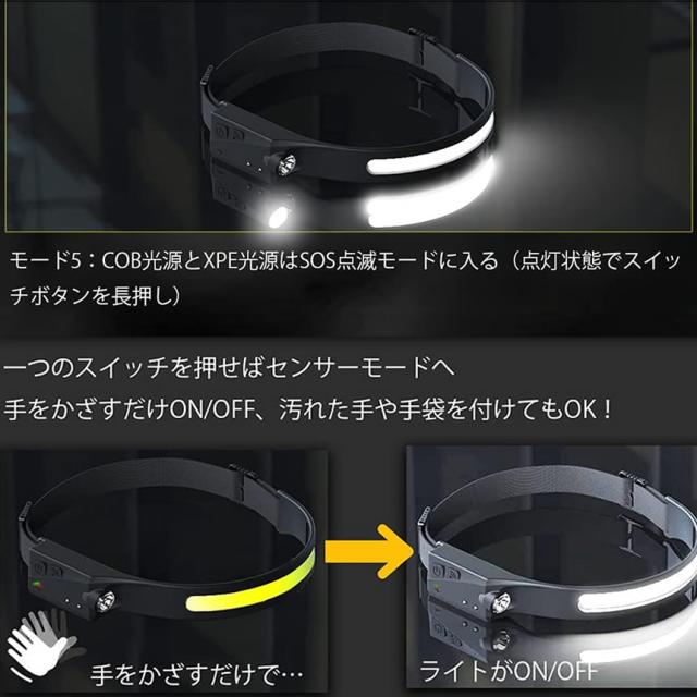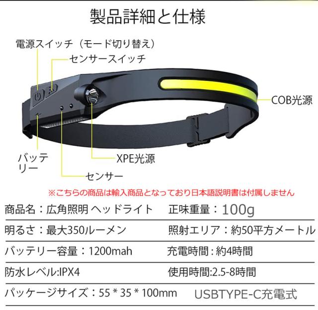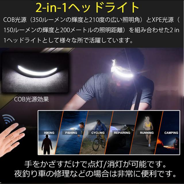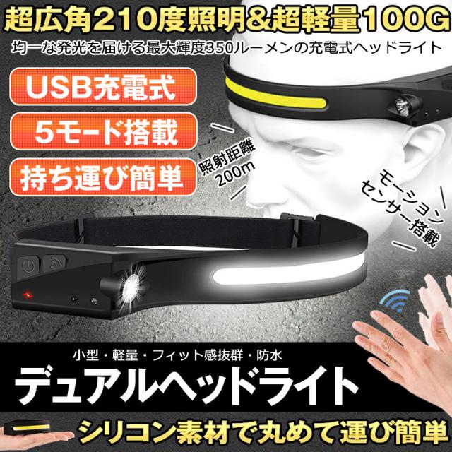 ヘッドライト 超広角 照射 充電式 USB LED デュアル ヘッドランプ 5種点灯モード 100g 軽量 アウトドア用 防水 釣り 登山 作業灯 懐中電灯 防災 DRYTO