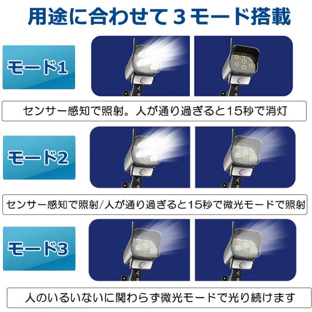リモコンで切り替え可能です、自動的に電気のオンオフをしてくれるので「うっかり」を防ぐことができます。光感センサーや人感センサーの機能付きます。ライトやパネルをセットする場合、夜間やソーラーパネルを覆われていると、自動的に点灯します;また検知範囲以内には人や動物が感知すると自動的に点灯します。