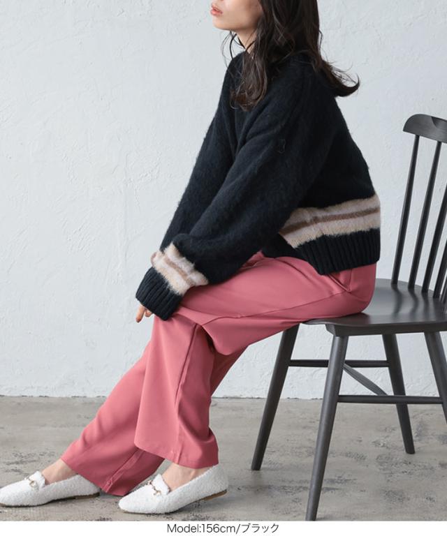 ボーダー ライン ニット トップス C6501 入荷済 レディース セーター 長袖 バイカラー クルーネック モヘアタッチ モヘヤ モヘア ゆったり 黒 ふわふわ もふもふ ボリューム デザイン パープル