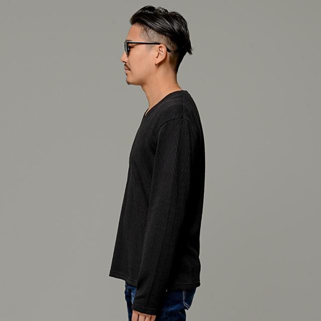 独特な素材の風合いとすっきりとしたVネックの首元で大人のスタイルにこなれ感を与えてくれる一着。