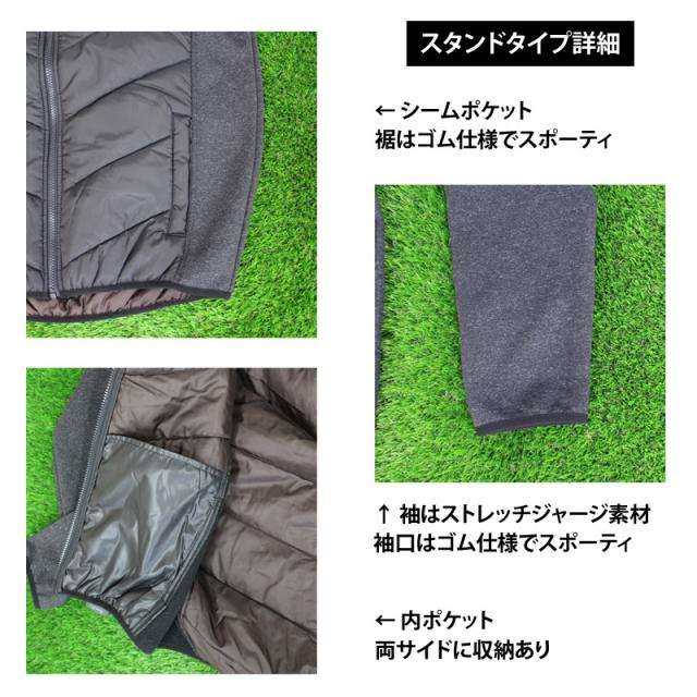 | 特徴 | フロントが中綿キルティングになった 暖かい裏起毛フリース素材ゴルフ上下セットアップ。 スタンドとパーカーデザインの2タイプ。 キルティング中綿ジャケットの袖と脇部分を ストレッチジャージ素材で切り替えたゴルフジャケットと 後ろ身頃がジャージのゴルフパンツ。 冬でも快適な暖かさのゴルフウェアです。 腰の右後ろにDカンが装着され便利です。 ウエストはゴム&紐で調節可能。 |