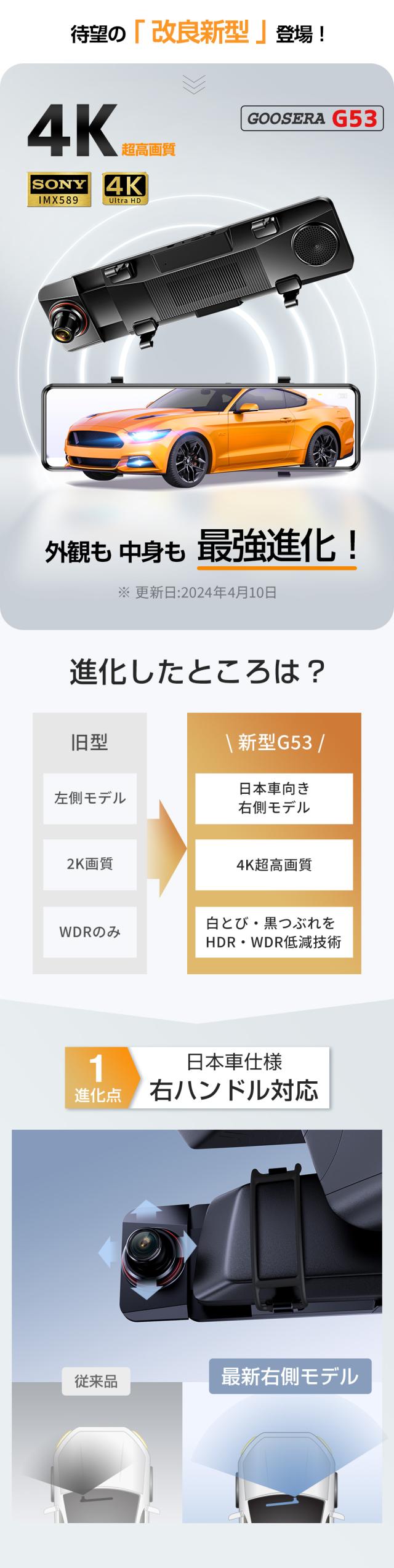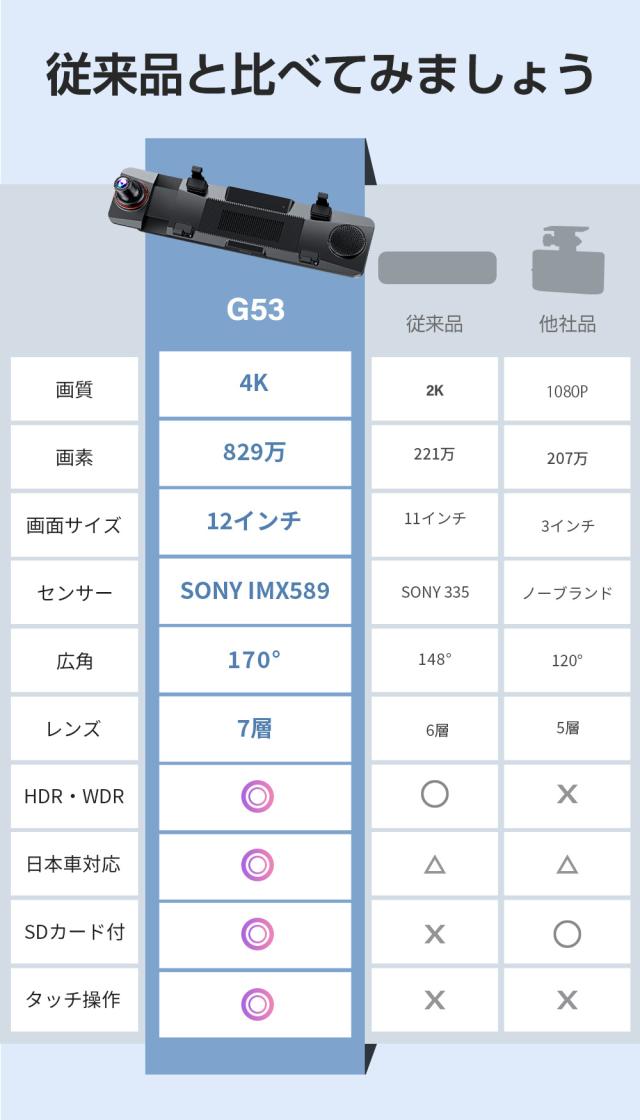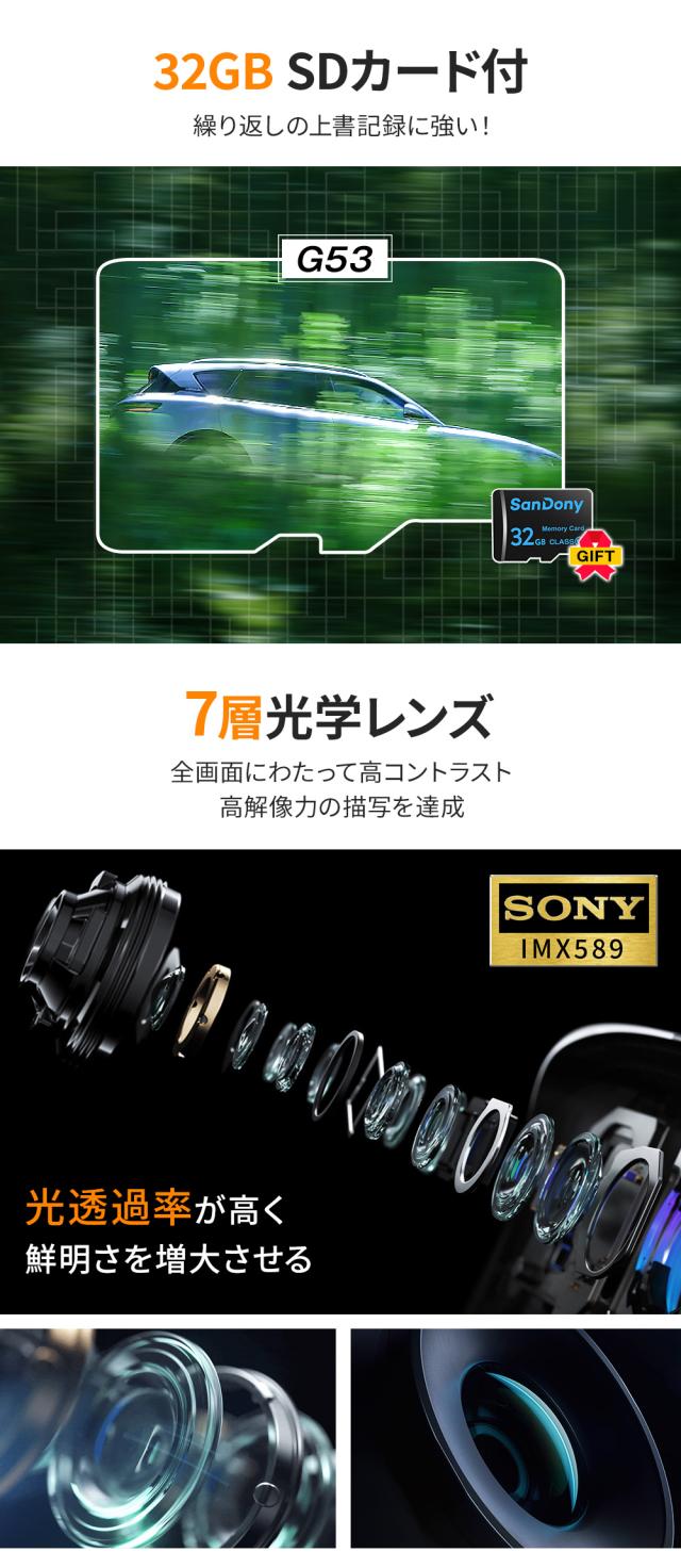 ドライブレコーダー業界先端のSonyIMX589センサーを採用し、2カメラ同時高画質録画可能フロントカメラフルHD4K+リアカメラフルHD1080Pを実現しました。万が一の時に、状況証拠を残すためには前方だけではなく、後方の記録することは重要です。そこて弊社は、フロントカメラとリアカメラをセットにして、前後同時録画可能、死角が少ないため、「あおり運転」や「後方からの追突」等からあなたをいつも見守って、安心ドライブをサポートします。