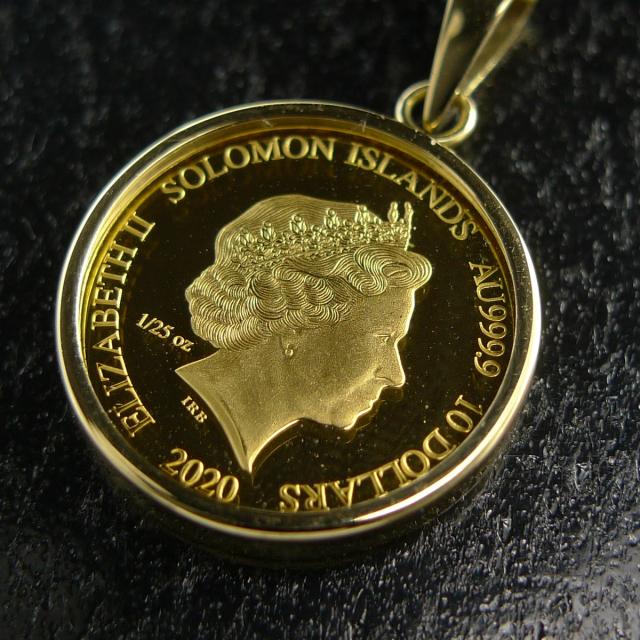 南太平洋の英連邦独立国・ソロモン諸島発行の1/25オンス純金コインに、K18製の枠が付いたペンダントトップです。