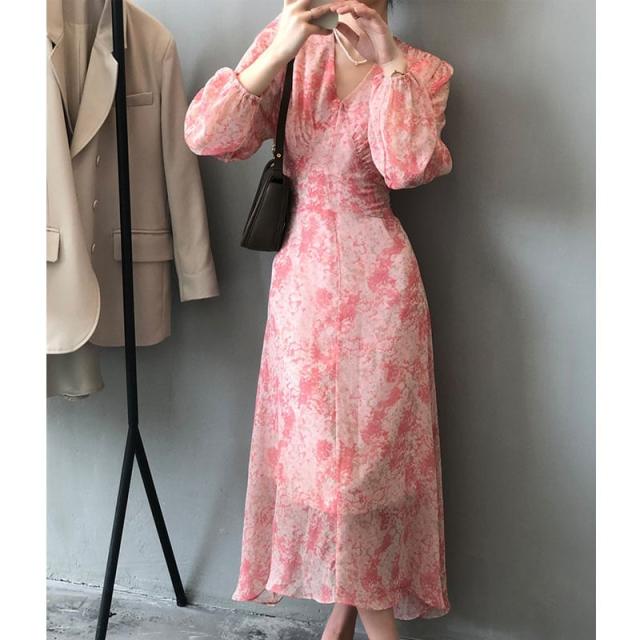 ワンピース 上着 人気 おすすめ おしゃれ お洒落プチプラ 長袖 ロング Vネック 柄 プリント シフォン パフスリーブ ボリュームスリーブ ウエスト とろみ 花柄 可愛い