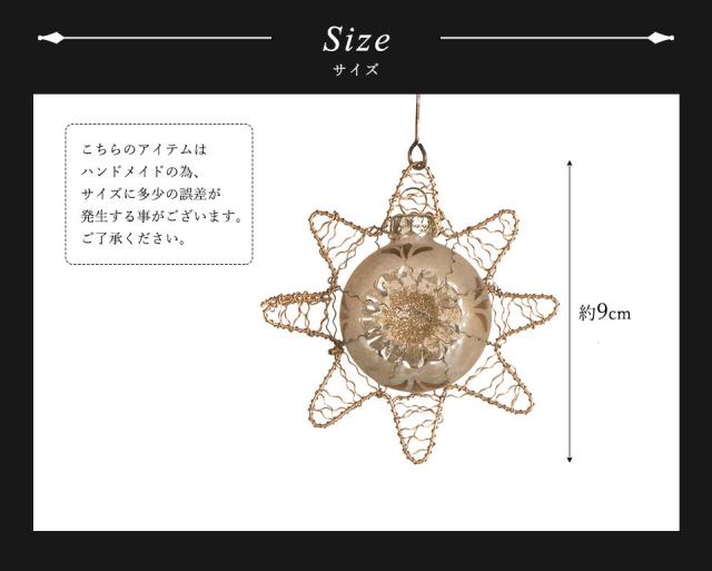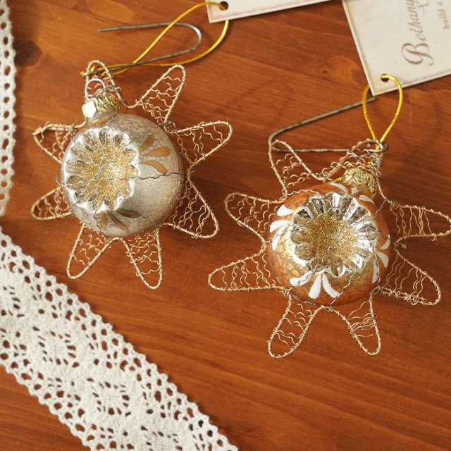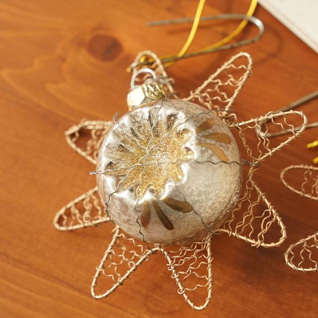 エレガントなゴールドボールオーナメントと星型のワイヤークラフトが融合したおしゃれなオーナメントです。