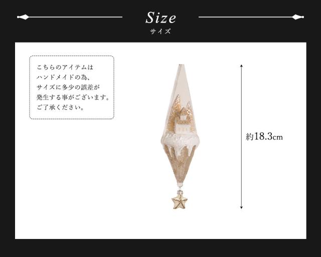 | ★森の中にひっそりと佇む教会のモチーフオーナメントです。 厳かな雰囲気に包まれたクリスマスを彷彿とさせるデザインが魅力です。 底には一番星を象ったスターオーナメントが吊るされています。 ハンガー部分に使用されたホワイトリボンが良いアクセントとなり、純白の雪が降り積もる教会に柔らかな印象を添えてくれます。 ぱっと目を引く華やかさがありつつもどこかノスタルジックな雰囲気が漂う素敵なデザインに仕上がっています。 クリスマスツリーに飾るのはもちろん、玄関先やリビングなどのインテリアとしてもお使いいただけます。 サイズは高さが約18.3cmです。 |