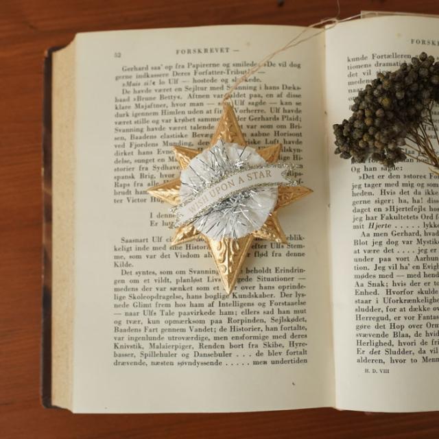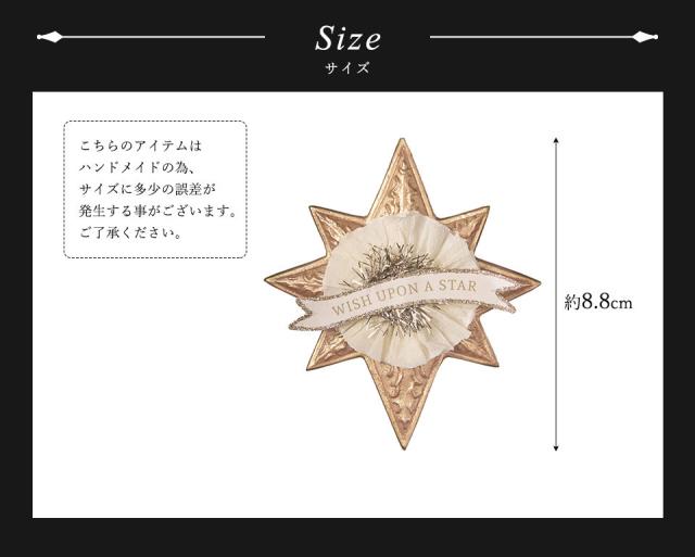 人気のスターモチーフをアンティーク調に仕上げたお洒落なオーナメント。上品な存在感を放つゴールドカラーが印象的です。中央にはペーパークラフトの可愛らしい白い花と「WISH UPON A STAR(星に願いを)」の文字。