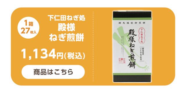 | 下仁田ネギを練りこんで香ばしく焼き上げた殿様ねぎ煎餅。香ばしい下仁田ねぎの香りと甘さで、大人からお子様まで幅広く召し上がれます。 |