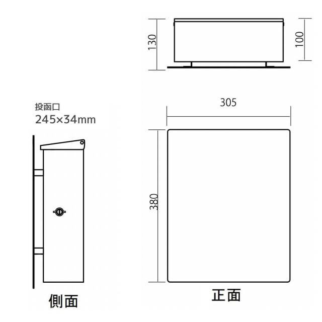 上から投函、手前から取り出すタイプのポストです。 投函口のサイズは245×34mm。角2封筒(A4版の雑誌やカタログが入る封筒)や回覧板にも対応しています。