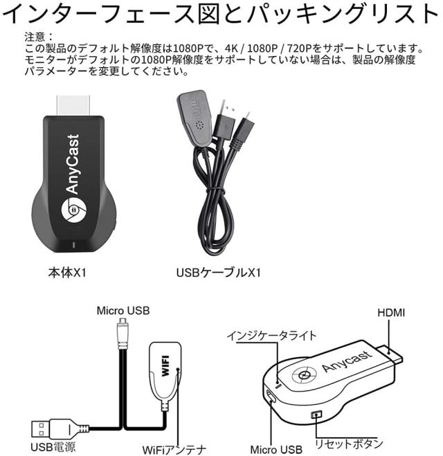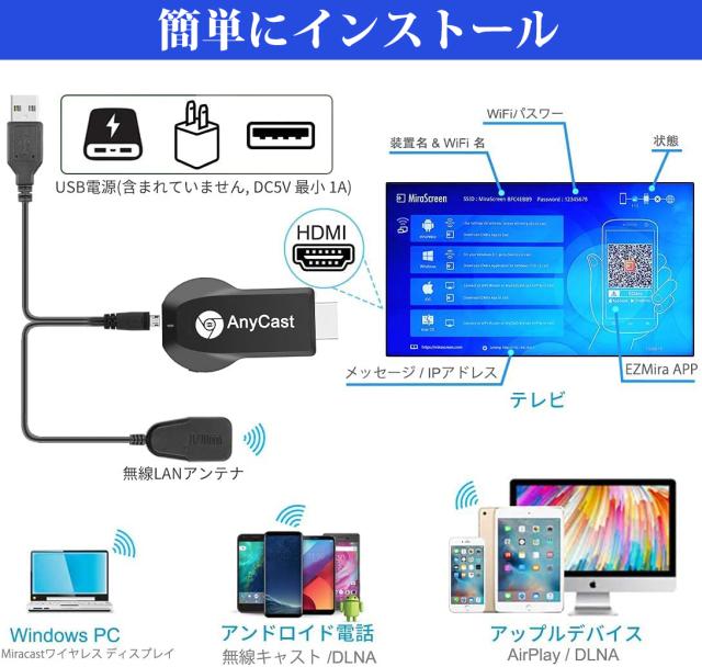 HDMI ワイヤレス レシーバー 日本語説明書付 AnyCast スマホ テレビに映す スマホの映像を映す iPhone パソコン テレビ TV モニター 無線 接続 android