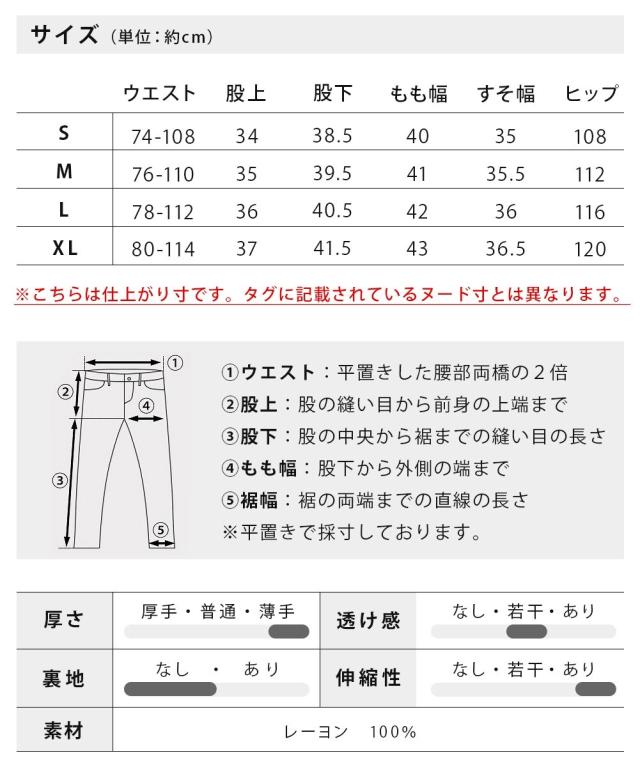 L : ウエスト78−112cm 股上36cm 股下40.5cm もも幅42cm 裾幅36cm ヒップ116cm