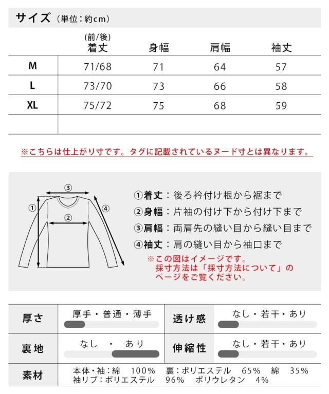L : 着丈(前/後)73/70cm 身幅73cm 肩幅66cm 袖丈58cm