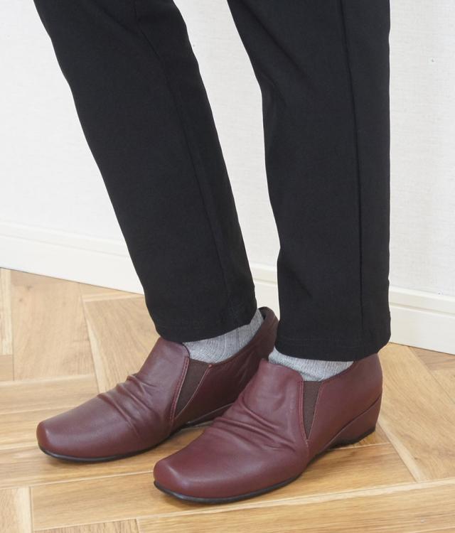 くしゅっとしたシャーリングデザインとスクエアトゥがおしゃれなカジュアルシューズです。