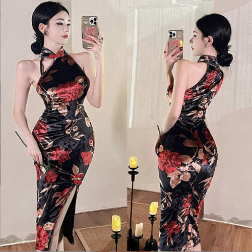 送料無料「沖縄、離島の方は除外です」チャイナドレス「M&Lサイズ チャイナセクシー光沢ベロアプリントミディアムドレス2」セクシーナイト、 キャバ 花魁 コスプレ 勝負服