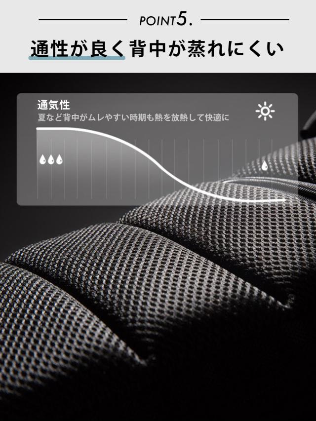 背面に通気性のある設計が施されており、背中が蒸れにくいので、長時間の使用も快適です。