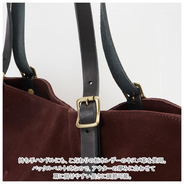 | 商品説明 | ・秋冬コーデに華を添える、温かみのある素材感。「Butler Verner Sails -バトラーバーナーセイルズ-」から、スエードビッグトートが新登場。 ・しっとりと滑らかな牛革スエード素材をふんだんに使用し、2mm厚の丈夫な生地を4枚繋ぎ合わせた十字のステッチがデザインのワンポイント。 ・メイン収納部は、大判の雑誌やB4サイズの書類に対応したビッグサイズで、通勤・通学用などの普段使いに最適なサイズ感。 ・開口部はスナップボタンで開閉するシンプルな構造で、小物の出し入れがスムーズ。 ・たっぷりのマチ幅に底板も付属しているため、ランチボックスやペットボトル、少し重みのある荷物もラクラク収納可能。 ・バッグ内側にはファスナーポケット×1、オープンポケット×2を設け、スマホや二つ折財布など、使用頻度の高い小物がサッと取り出しやすいつくり。 ・持ち手ハンドルにも、こだわりの栃木レザーの牛ヌメ革を使用。バックルベルト式なので、アウターの厚みに合わせて肩に掛けやすい長さに調節可能。 ・冬の装いに上品な印象をプラスする、落ち着きのあるカラーリングでジェンダーレスなコーディネートが実現。安心のMade in Japan製品。 |