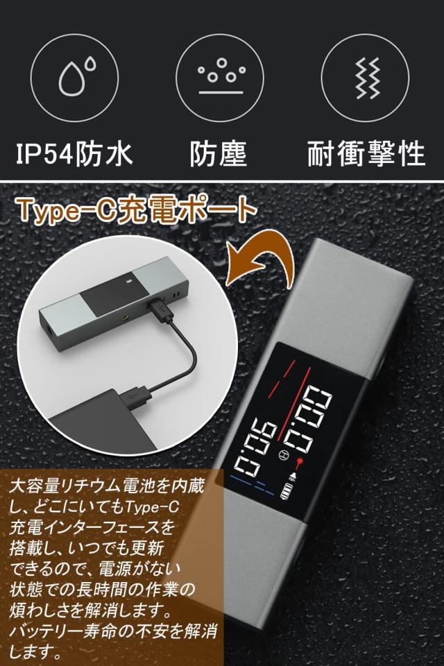 【730 mAhバッテリー内蔵で繰り返し充電できる&Type-C USB充電】:この傾斜計は730 mAhの大容量バッテリー内蔵で一度充電を完了したら 約3.5時間の連続使用が可能で、待機時間は300日以上です。