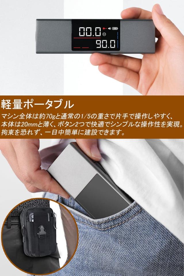 【軽量&IP54生活防水&防塵&ウエストポーチ付き】:角度測定器サイズ:12*3.5*2cm 182g人間工学に基づいた設計、超軽量ながら握りやすいで、片手で安定して測定可能です。