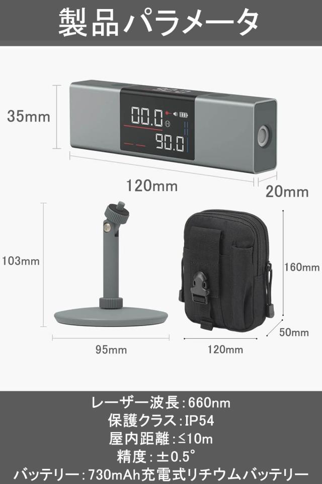 パラメータ 波長:650±5nm レベリング精度:±0.5° 電源:730mAh充電式バッテリー 動作温度範囲:-10℃-+50℃ 保管温度範囲:-20℃-+55℃ バッテリー寿命:3.5時間 内容物:デジタル角度計、スタンド、ウエストポーチ