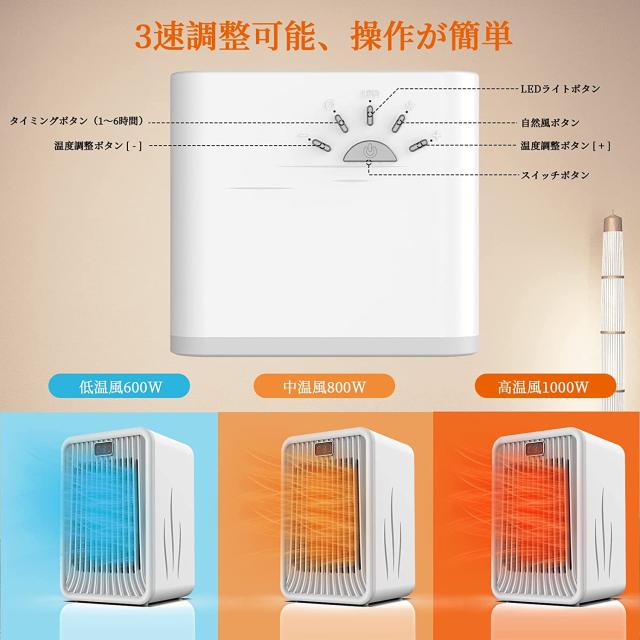 コンパクト電熱器 小さくて暖かい 省エネ2秒加熱3段階切替タイミング機能過熱保護転倒保護低騒音カラフルな常夜灯LED表示 2022年にバージョンアップしたセラミックヒーターは、小型で暖かく、待ち時間なく2秒ですぐに温まります。