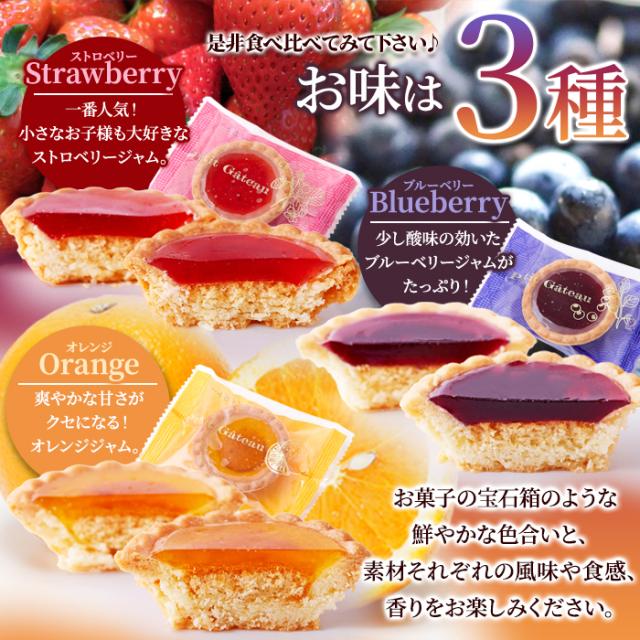 【見た目にも美しい】キラキラジャムのタルト♪ イチゴ・ブルーベリー・オレンジの3種類の味が食べ比べできます!!個包装30個入りでお届けいたします!!