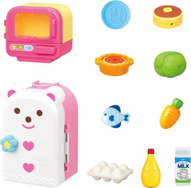 ・セット内容:レンジ、れいぞうこ、お皿、たべものパーツ8個(キャベツ、にんじん、さかな、たまご、牛乳、マヨネーズ、ミートドリア、ホットケーキ)