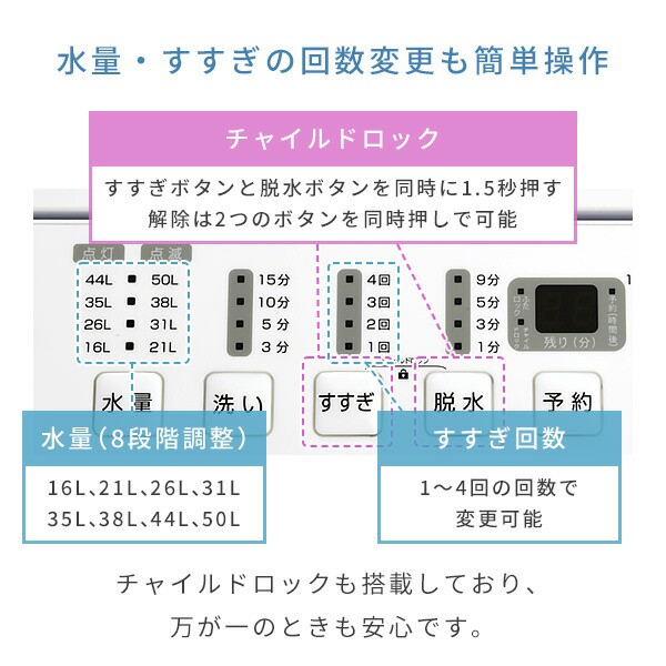 | 商品説明 | ●電源:AC100V(50/60Hz) ●洗濯時消費電力:410/470W(50/60Hz) ●標準使用水量:112L ●標準洗濯・脱水容量:6.0kg ●洗濯方式:うず巻式 ●水道水圧:0.03-0.85Mpa ●選べるコース:標準・毛布・おいそぎ・ドライ・ソフト・つけおき・部屋干し・槽洗浄●メーカー保証:1年間 |