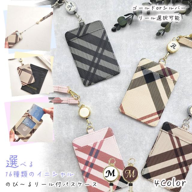 パスケース リール付き レディース 定期入れ ID IC カード 入れ カードホルダー マイナンバーカードケース チェック柄 名入れ ストラップ 高校生 レザー 薄型 イニシャル シール かわいい おしゃれ 社会人 大人 通勤 通学 メンズ リール