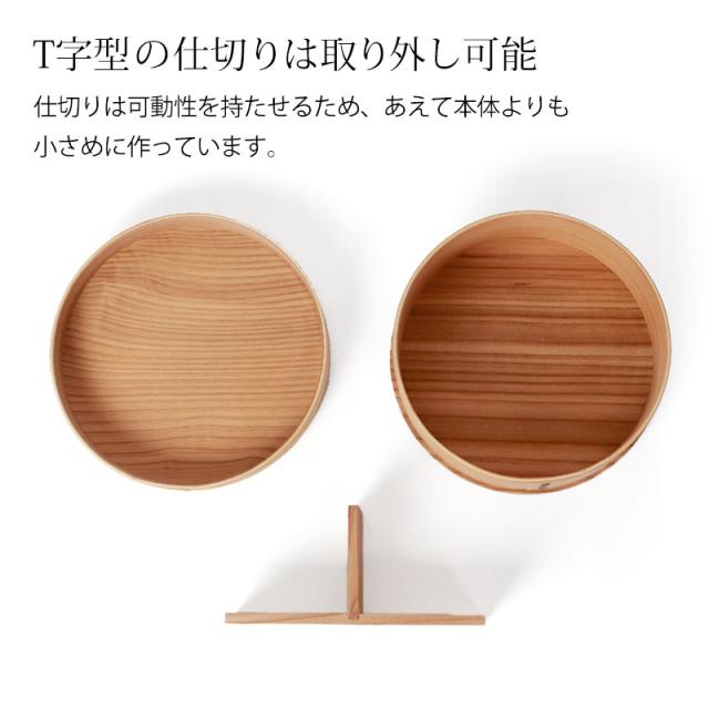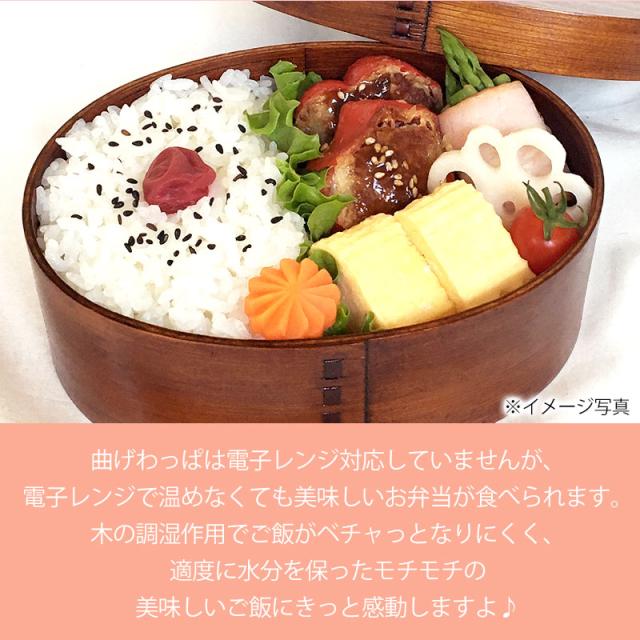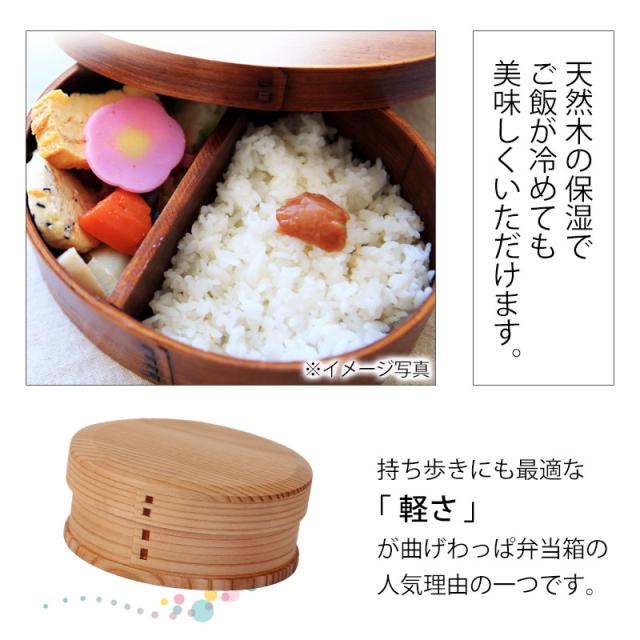 | 商品説明 | 曲げわっぱ弁当箱は木で作られています。これによって弁当箱の中の水分を調節してくれるので、夏はごはんが傷みにくく、冬はごはんが固くなりにくく、一年を通して非常に機能性の高いお弁当箱です。 曲げわっぱは電子レンジ対応していませんが、電子レンジで温めなくても美味しいお弁当が食べられます。 また、食洗機対応ではございませんが、ウレタン塗装を施していますので、手洗いで簡単に洗うことができます。 見て懐かしく、でも、今の時代にはモダンに映る「わっぱ弁当箱」手に取ると、軽くて木の温もりを感じるやさしい気持ちに。 ほのかな木の香りが心地よく、懐かしく温かい気持ちになる使い心地。 日本文化のお弁当を曲げわっぱでおしゃれに普段使いに使っていただければ幸いです。 工芸品が身近にあることで、伝統文化の継承につながればと、ささやかながら願っています。 ご入学、ご就職で、新しい生活がはじまります。お弁当箱も新しくして、新鮮な感覚を楽しんでみませんか。 自然素材の木のお弁当箱で、ゆっくりと食べるのも良いものです。 取り外し可能なT字型の仕切り付き。 |