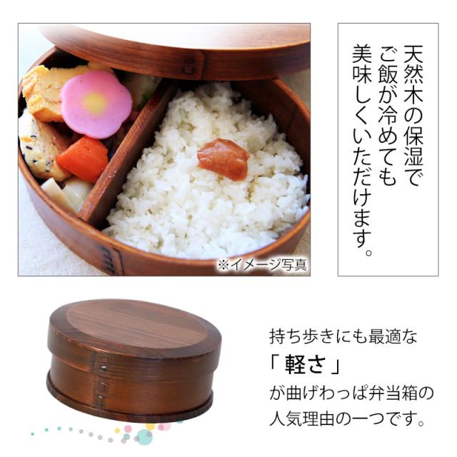 | 商品説明 | 曲げわっぱ弁当箱は木で作られています。これによって弁当箱の中の水分を調節してくれるので、夏はごはんが傷みにくく、冬はごはんが固くなりにくく、一年を通して非常に機能性の高いお弁当箱です。 曲げわっぱは電子レンジ対応していませんが、電子レンジで温めなくても美味しいお弁当が食べられます。 また、食洗機対応ではございませんが、漆塗りを施していますので、手洗いで簡単に洗うことができます。 見て懐かしく、でも、今の時代にはモダンに映る「わっぱ弁当箱」手に取ると、軽くて木の温もりを感じるやさしい気持ちに。 ほのかな木の香りが心地よく、懐かしく温かい気持ちになる使い心地。 日本文化のお弁当を曲げわっぱでおしゃれに普段使いに使っていただければ幸いです。 工芸品が身近にあることで、伝統文化の継承につながればと、ささやかながら願っています。 ご入学、ご就職で、新しい生活がはじまります。お弁当箱も新しくして、新鮮な感覚を楽しんでみませんか。 自然素材の木のお弁当箱で、ゆっくりと食べるのも良いものです。 取り外し可能なT字型の仕切り付き。 |