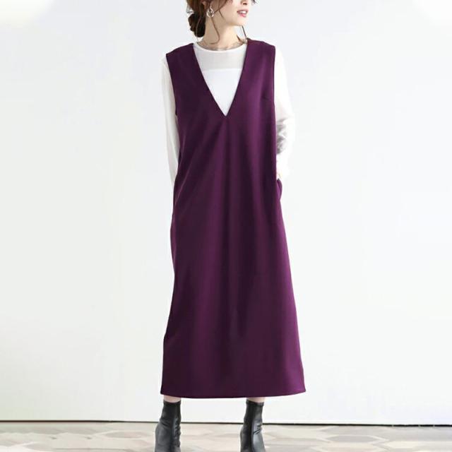 ★キーワード:Iライン ワンピース ジャンパースカート vネック 大人 秋 冬 秋冬 レディース 大きいサイズ きれいめ おしゃれ オフィスカジュアル セット ジャンスカ 膝丈