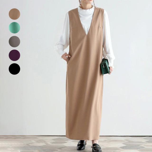 ジャンパースカート ノースリーブワンピース Iライン ジャンスカ vネック マタニティ レディース 春秋冬 体型カバー ストレート