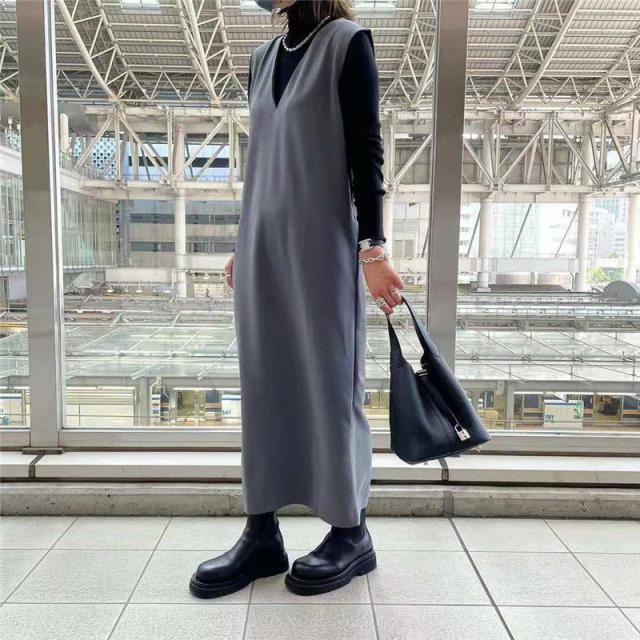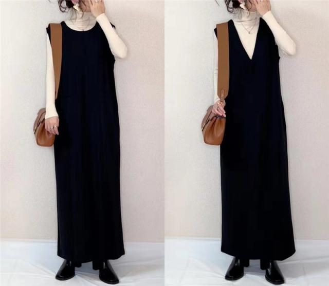 ジャンパースカート ノースリーブワンピース Iライン ジャンスカ vネック マタニティ レディース 春秋冬 体型カバー ストレート