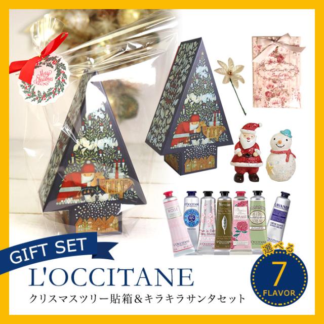 女性に人気のロクシタンのハンドクリーム(30ml)とキラキラマスコット、サシェをクリスマスツリー貼箱にセットしたクリスマスギフトセットです。