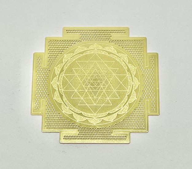 インド神聖幾何学の図形に、言葉であるマントラ(真言)を図形にしたヤントラがあります。その中でも「ヤントラ中のヤントラ」と呼ばれるのが、シュリ・ヤントラ(SRI YANTRA)です。シュリ・ヤントラは、時空を超越した全宇宙エネルギーであり、生命体、有機物無機物の魂のエネルギーです。上向きの三角がシヴァ(男性性)下向きの三角がシャクティ(パールバティ、女性性)を表します。