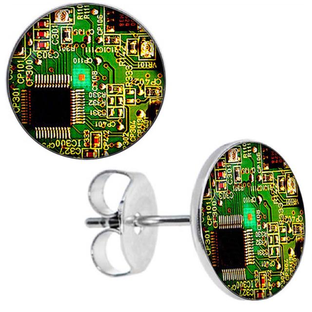 リアルなICチップをデザインした丸いカボションをスタッドピアスにセットしたオモシロくてユニークなファッションピアス。