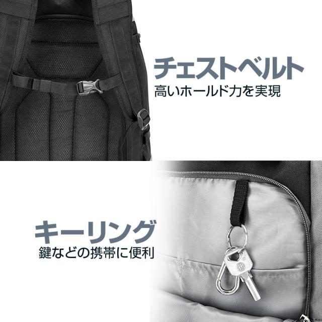 また、快適に背負えるチェストベルトや鍵類の携帯に便利なキーリング、通気穴やパスケースなど嬉しい機能も充実しています。