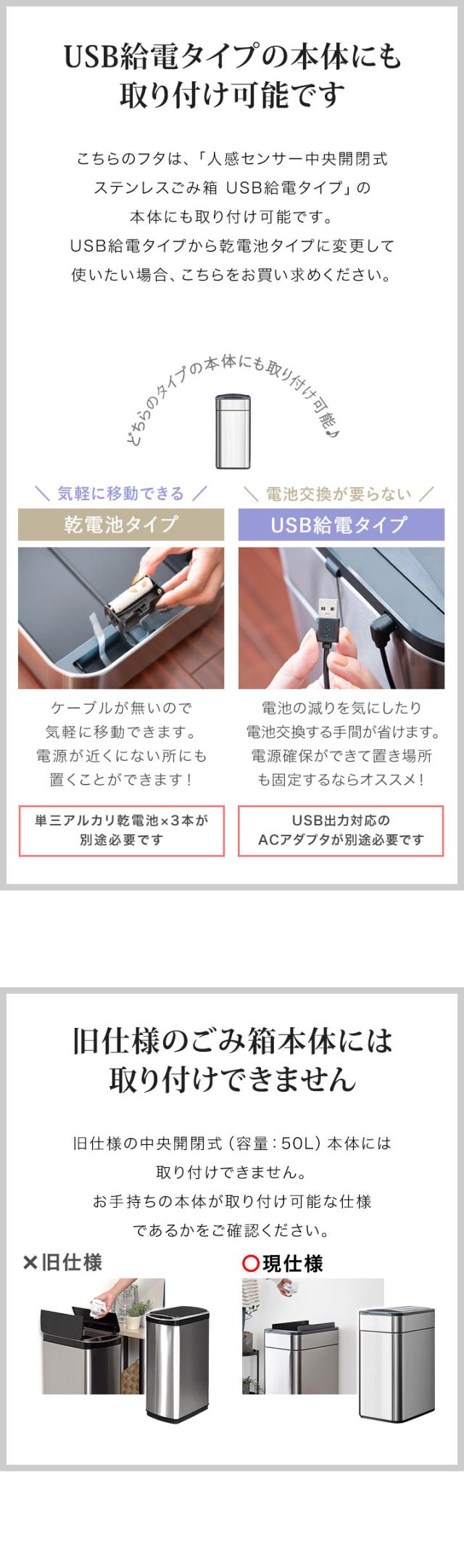 | 特記事項: ・本商品には電池は付属しておりません。 ・こちらは「人感センサー中央開閉式ステンレスごみ箱 (容量:40L / 50L / 60L)」交換用のフタとなります。 本体は付属しませんのでご注意ください。 ・旧仕様のごみ箱本体にはお取付けできません。お手持ちのご本体が取付け可能な仕様であるかをご確認下さい。 【動作についての注意】 開閉が遅くなったり、蓋が途中までしか開閉しない場合、電池の残量が少なくなっている可能性があります。 必ず全て新品のアルカリ電池に交換して動作確認を行ってください。 ※古い電池が混じっているとパワーが足りず動作に異常が出る可能性があります。 【蓋のお手入れについての注意】 さっと水拭きして頂くだけで簡単にお掃除ができますが、水を多く含んだ状態で水拭きを行うと蓋の隙間から水が浸入し破損の原因となります。 水拭きを行う際は固く絞り、水をよく切ってから行ってください。 【設置場所についての注意】 蓋に水がかかってしまうような場所には設置しないでください。 水が蓋に入り込んでしまうと破損の原因となります。 |