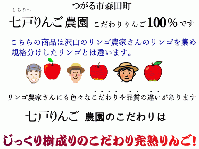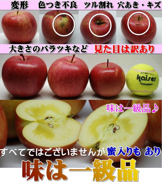 ●無袋栽培 リンゴを紙袋に包まず育てる方法で日光がより多く当たる分、有袋栽培よりも色むらがありますが甘みがあります。「味を優先とした栽培方法と言えます」 ●味と肉質 酸味は少なく甘みが強くシャキシャキして果汁が多いのが特徴です。 ●訳ありで お得価格 デパートなどで売られるりんごと違うのは見た目だけ・・ということになりますので「ご家庭用」として充分お楽しみいただける商品です。 ★訳あり商品ではございますが、ご安心して美味しくいただけるよう厳選・選果して発送しております。 (個数指定はできませんのでご了承お願いいたします。) |