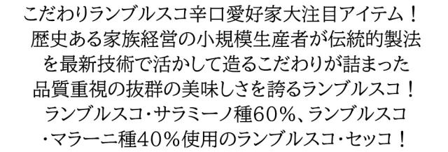 こだわりランブルスコ辛口愛好家大注目アイテム!歴史ある家族経営の小規模生産者が伝統的製法を最新技術で活かして造るこだわりが詰まった品質重視の抜群の美味しさを誇るランブルスコ!ランブルスコ・サラミーノ種60%、ランブルスコ・マラーニ種40%使用のランブルスコ・セッコ!■さまざまなギフトアイテムをご用意しております。お中元 ギフト 御中元 お盆 お礼 敬老の日 クリスマス 冬ギフト お歳暮 御歳暮 お年賀 御年賀 お正月 年末年始 ご挨拶 バレンタイン ホワイトデー お返し 父の日 母の日 ギフト 贈答品 お土産 手土産 御祝 御礼 内祝い 引き出物 お祝い 結婚祝い 結婚内祝い 出産祝い 出産内祝い 引き菓子 快気祝い 快気内祝い 進学祝い 誕生日祝い バースデーケーキ プレゼント Wedding ウェディング ホームパーティ お花見 パーティ 退職ギフト 退職 就任祝い