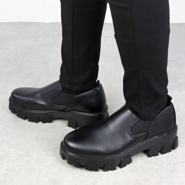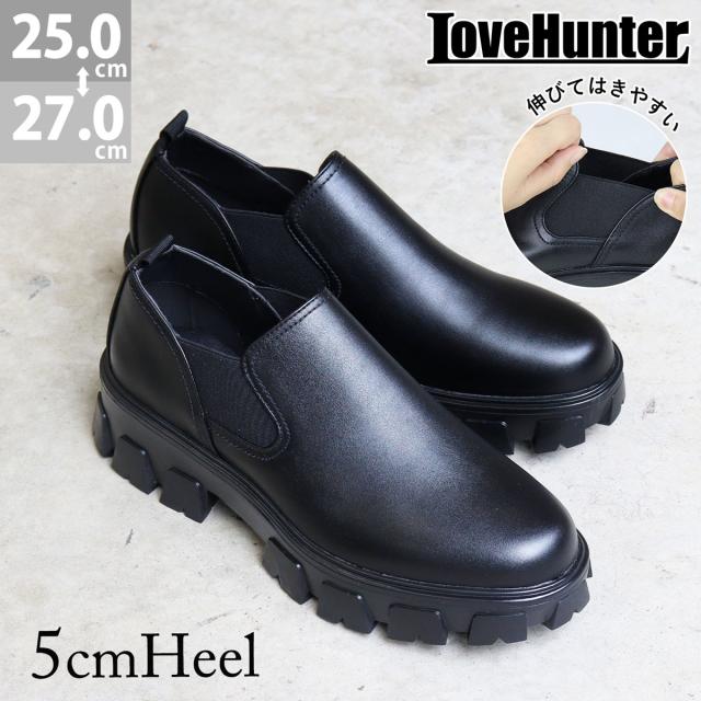 カジュアルシューズ メンズ サイドゴア 厚底 タンクソール 滑りにくい ショート ローカット No.1729 25.0-27.0cm 合成皮革 PUレザー 美脚 シンプル スタイルアップ 5cmヒール 黒 ブラック おしゃれ 防滑 歩きやすい 靴 履きやすい LOVEHUNTER ラブハンター