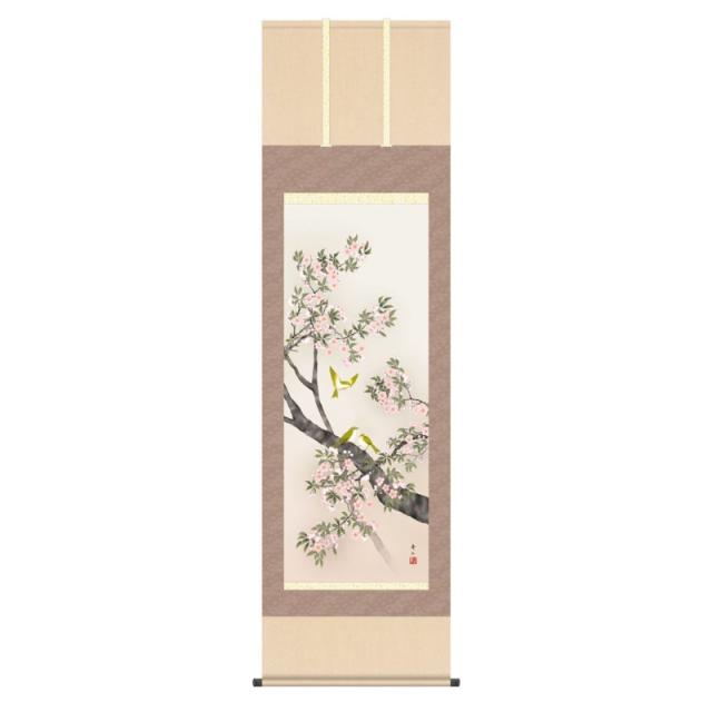 掛軸 日本画 花鳥画 鈴村秀山 桜花に小鳥 (おうかにことり) 尺五 (KZ3A6-36A) (代引き不可)