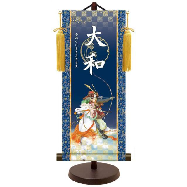 モダン友禅 名入掛軸 端午の節句 純金襴緞子 金紋入り・武者 名前・生年月日入り 専用スタンド付 小 (YTB-022) 和モダン名前掛軸【代引き不可】