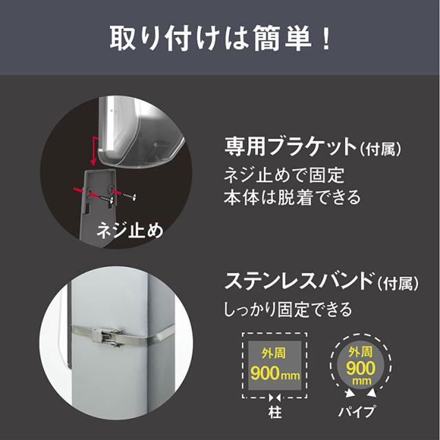 【付属品】ステンレスバンド (長さ:1m)×1 ・ 取り付けネジ×2 ・コンクリート用プラスチックプラグ×2