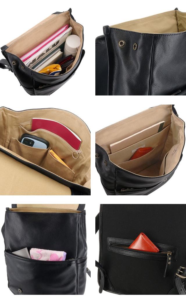 大きなフラップで開閉ができ、PCや資料なども収納しやすいです。