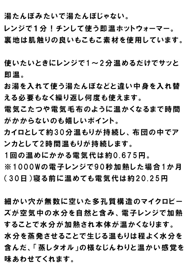 湯たんぽみたいで湯たんぽじゃない。レンジで1分!チンして使う即温ホットウォーマー。 |