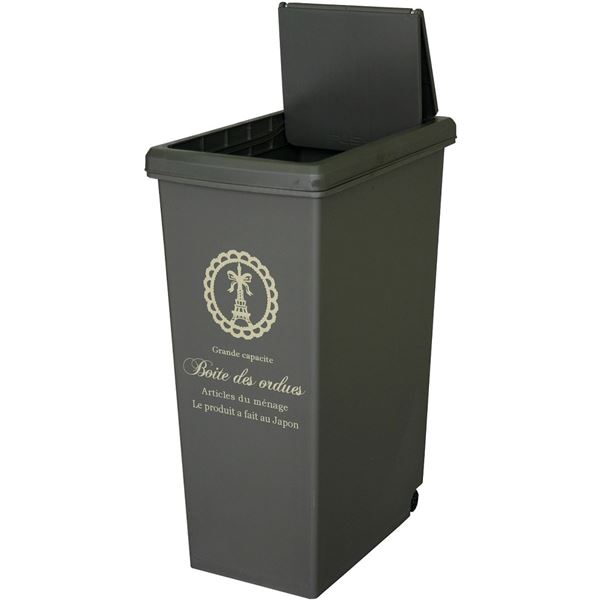 フタオープン時最大高さ76.5cmなので、ラック下や高さ制限がある場所でも使用できて便利。フタはスライドタイプなので、ワンタッチで開閉ラクラク。フタが開いた状態で固定できるので、ゴミ袋の交換やゴミを捨てる度にフタを開閉する必要がなく、料理をしながらでもゴミを捨てることができます。幅27cmのコンパクトサイズ、人気の艶消し加工タイプです。本体後ろ側にはコロ付き、本体正面には引手付きなので、お掃除する際やラック下などでご使用の際、出し入れがラクラクです。本体正面はお洒落なデザイン印刷付きなので、どんなお部屋でも馴染むゴミ箱です。ゴミ袋を固定する便利な袋止め付きです。