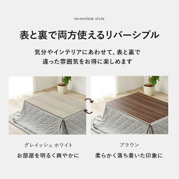 リバーシブルで使えるこたつ天板。天板を変えれば長年お使いにのこたつを新品のようにリニューアルできます。