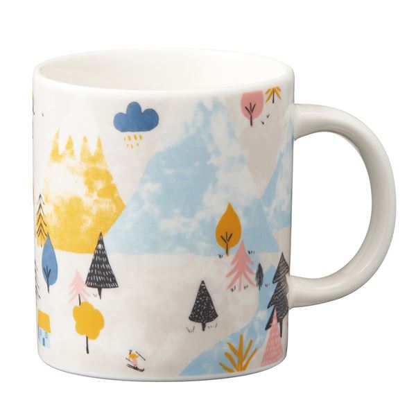 よく見ると、スキーを楽しむ人々や山で暮らすイエティがいます。柄を目で追っていくのが楽しくなる、ストーリーのあるデザインです。プレゼントに最適。